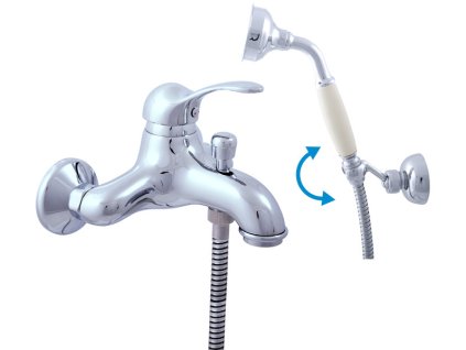 Nástenná vaňová batéria so sprchou a otočným držiakom.