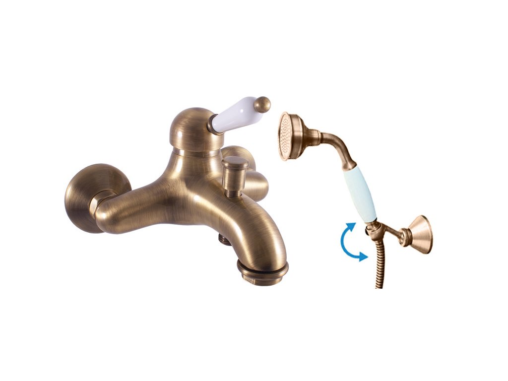 Nástenná vaňová batéria so sprchou a otočným držiakom.