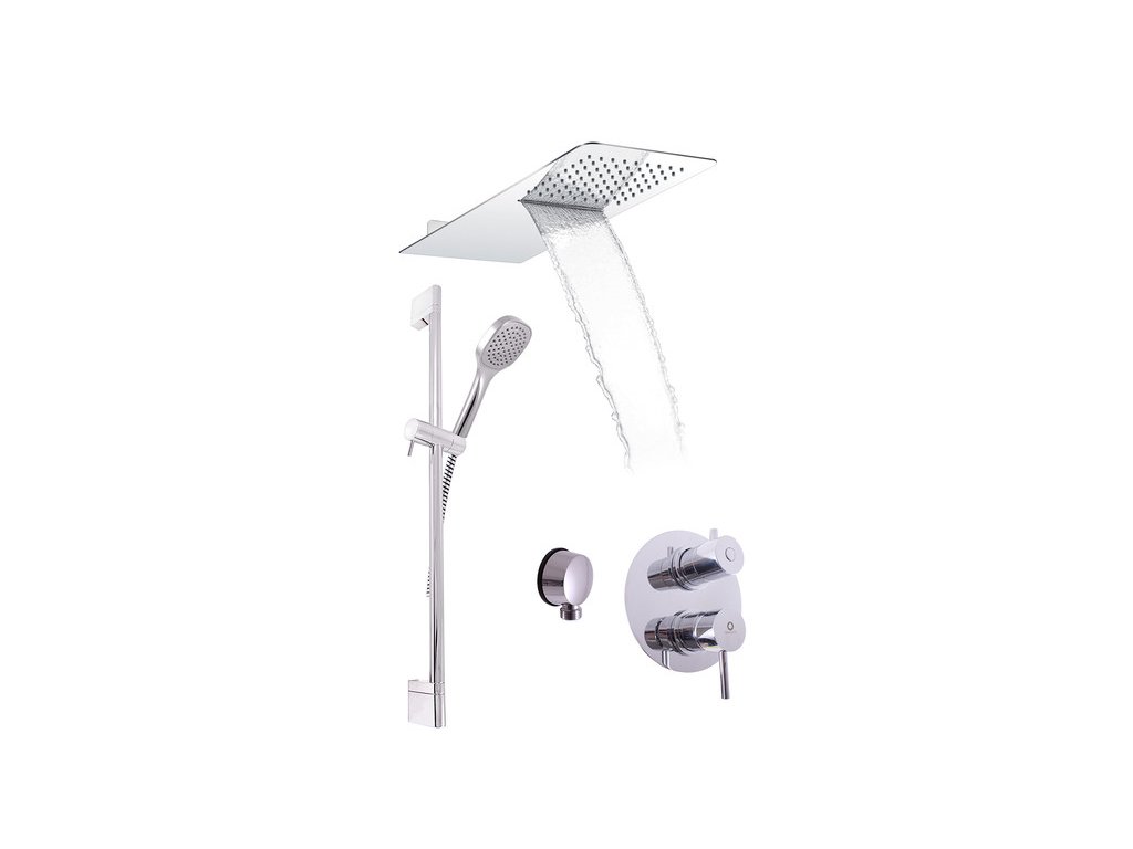 Sprchová súprava vrátane batérie s trojcestným keramickým prepínačom, ručnej sprchy a hlavovej sprchy s vodopádom.